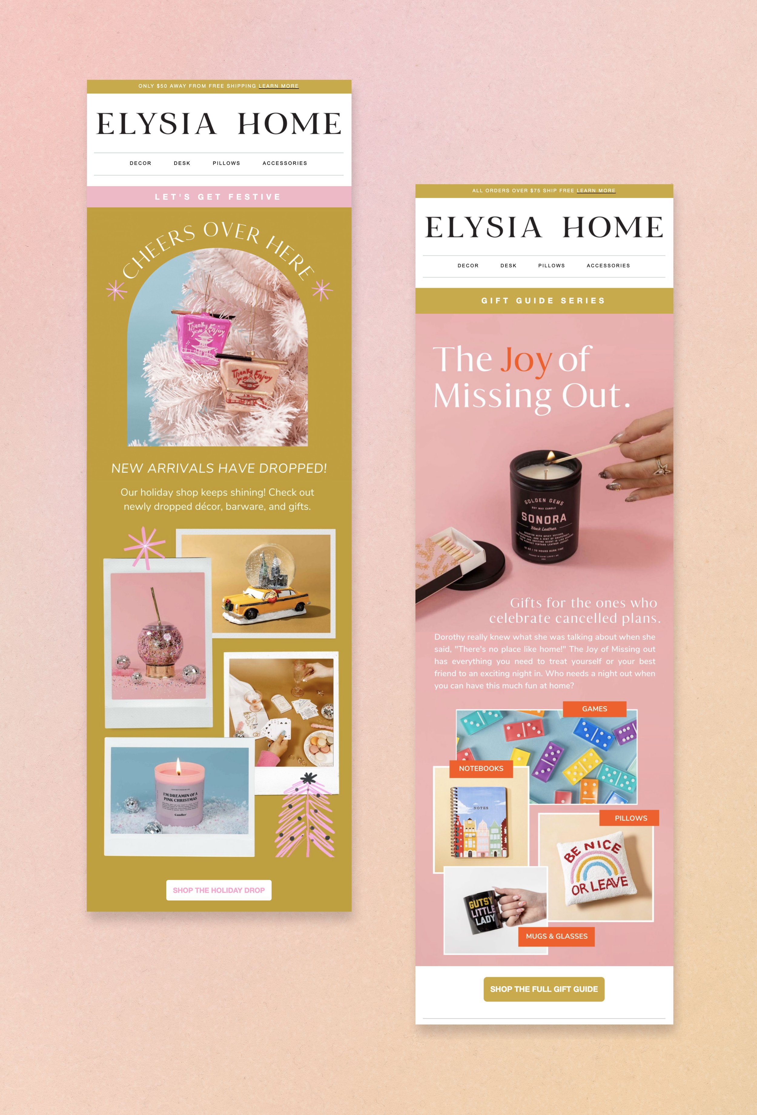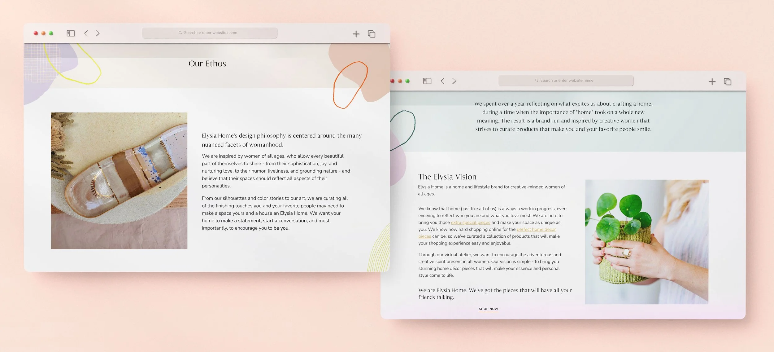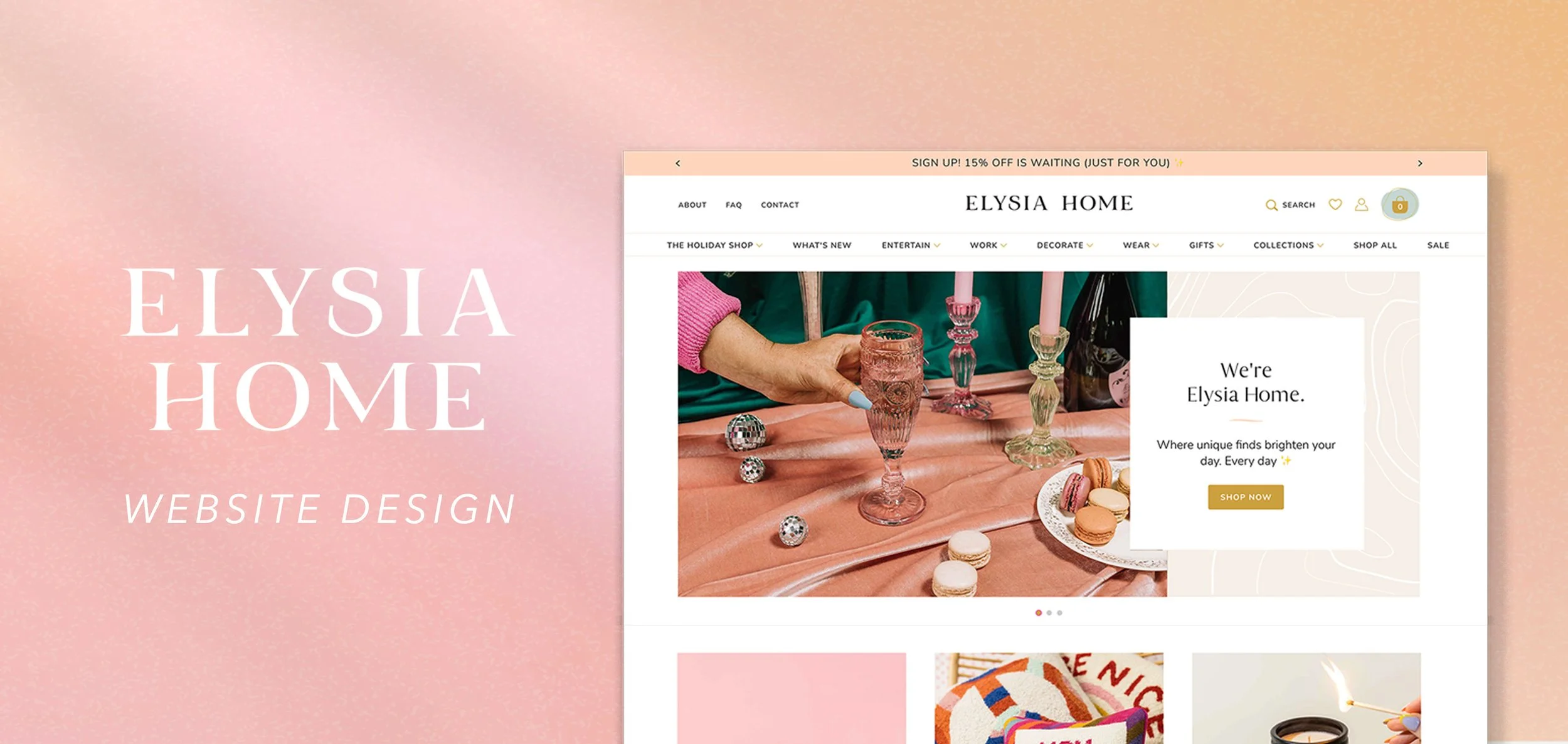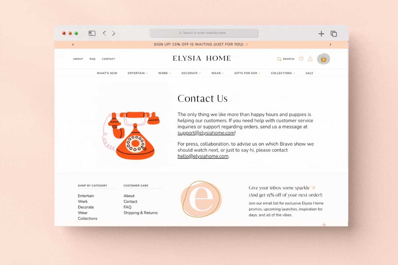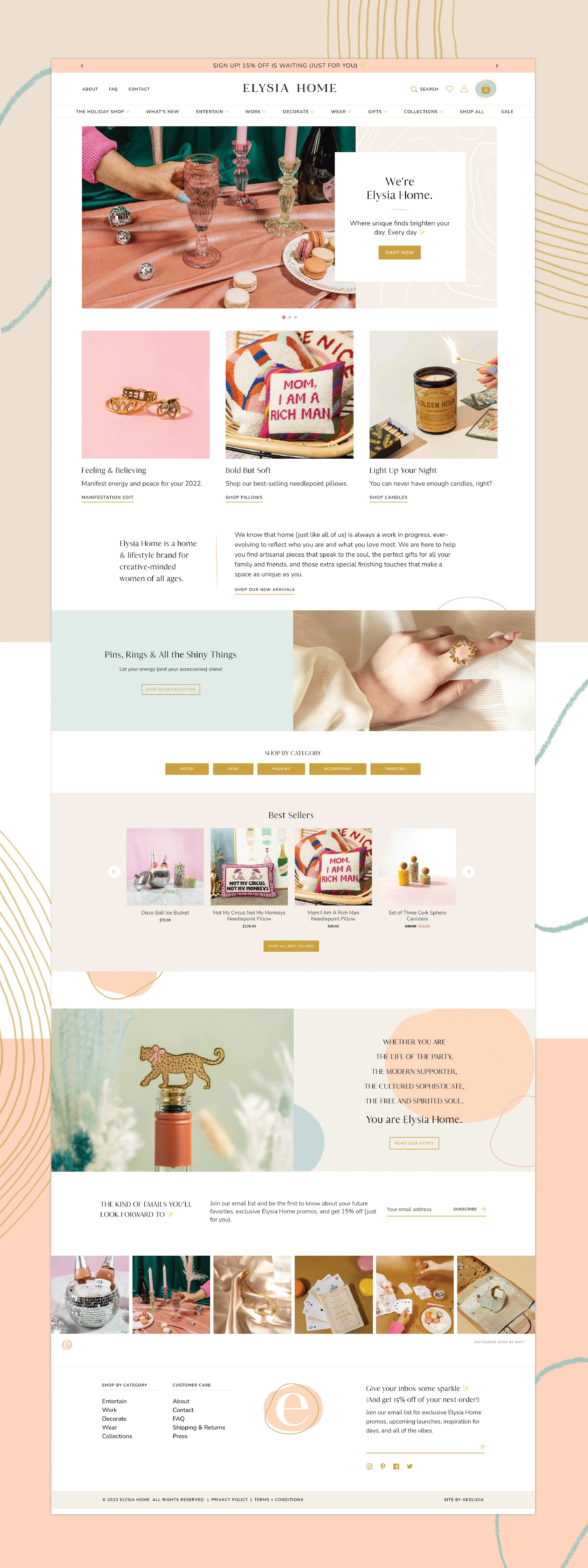 The Elysia Home website needed to be a place full of fun and confidence. To target our audience of Gen X, Millennial, and Gen Z shoppers we had to create a strategy for exceptional ease of use, and a graphic style that enhanced the shopping experience without overpowering the product. We partnered with Shopify experts Aeolida to develop a solution that kept imagery front and center on an inviting backdrop full of color.